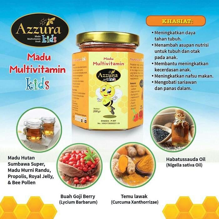 Madu Azzura kids, adalah kombinasi dari madu hutan Sumbawa dengan Madu Randu. Kedua Madu ini mempunyai keistimewaan, dimana Madu Sumbawa adalah madu yang kaya dengan vitamin, mineral dan anti oksidan juga mengandung Bee Pollen, Royal Jelly dan Propolis